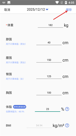 3、填寫完全部數(shù)據(jù)后,點擊右上角【保存】按鈕,完成本次身體指標(biāo)的記錄操作。