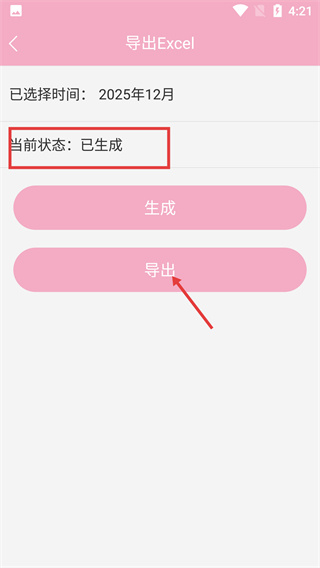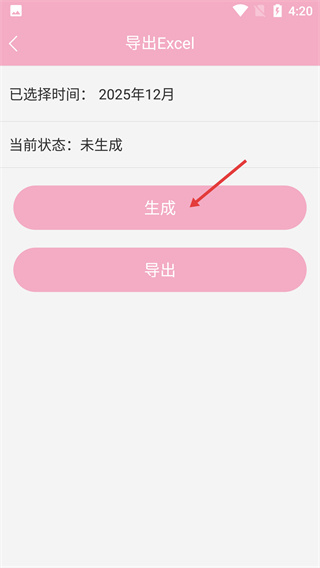 3、在【導(dǎo)出Excel】頁確認(rèn)時間為【2025年12月】后,點(diǎn)擊【生成】按鈕,將周期數(shù)據(jù)生成為Excel文件。