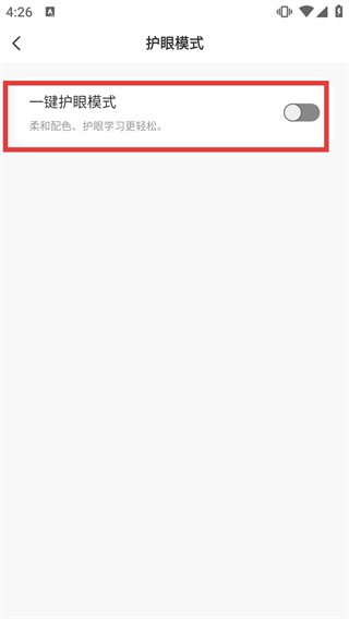 4、在【護眼模式】頁面,點擊【一鍵護眼模式】對應的開關(guān)按鈕,開啟該模式以獲得柔和配色的學習界面。