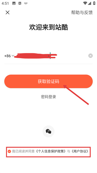 3、勾選【我已閱讀并同意】相關(guān)協(xié)議后,點(diǎn)擊【獲取驗(yàn)證碼】按鈕,觸發(fā)短信驗(yàn)證碼的發(fā)送流程。