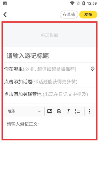 3、在游記編輯頁,需完善【添加封面】、【游記標(biāo)題】、【所在位置】及【游記正文】等信息,完成內(nèi)容編輯。