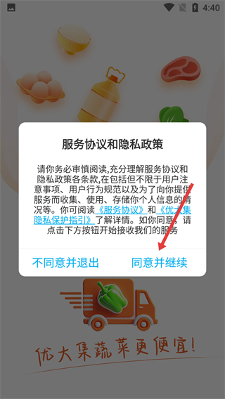 1、閱讀《服務(wù)協(xié)議》和《隱私保護(hù)指引》后,點(diǎn)擊彈窗中的“同意并繼續(xù)”按鈕,進(jìn)入應(yīng)用的主界面。