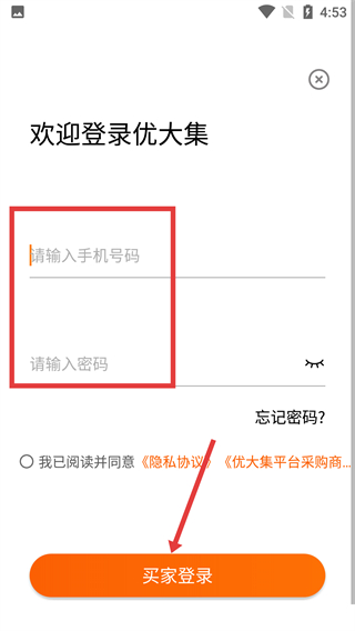 4、在歡迎登錄頁(yè)面,填寫(xiě)手機(jī)號(hào)碼與密碼,勾選相關(guān)協(xié)議后點(diǎn)擊“買家登錄”按鈕,完成賬號(hào)的登錄操作。