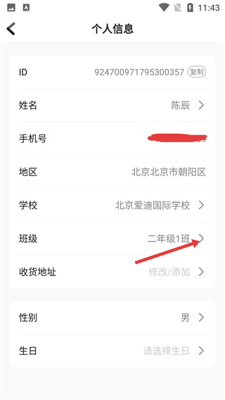 3、在個(gè)人信息頁面,點(diǎn)擊“班級(jí)”選項(xiàng),進(jìn)入完善信息頁面,準(zhǔn)備調(diào)整班級(jí)相關(guān)信息。