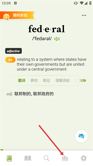 1、在單詞詳情頁(yè),點(diǎn)擊底部【統(tǒng)計(jì)】按鈕,進(jìn)入學(xué)習(xí)數(shù)據(jù)統(tǒng)計(jì)頁(yè)面。