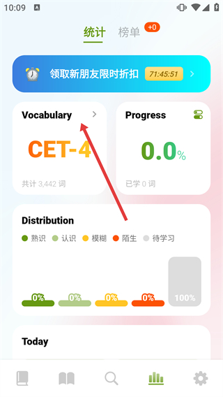 2、在統(tǒng)計(jì)頁(yè)面找到【Vocabulary】板塊,點(diǎn)擊【CET-4】選項(xiàng),進(jìn)入對(duì)應(yīng)的單詞表列表界面。
