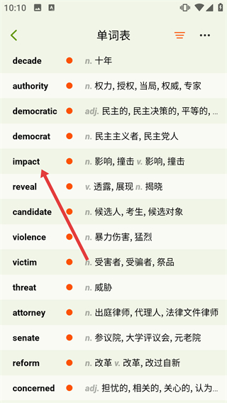 3、在CET-4單詞表中選擇目標(biāo)單詞如【impact】,點(diǎn)擊該單詞條目,進(jìn)入其詳細(xì)學(xué)習(xí)頁(yè)面。