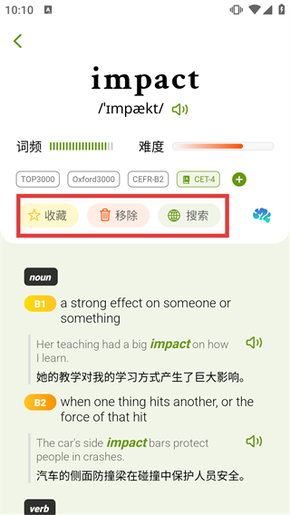 4、進(jìn)入【impact】詳情頁(yè)可查看詞頻-難度及釋義,使用【收藏】【移除】等按鈕管理該單詞的學(xué)習(xí)狀態(tài)。
