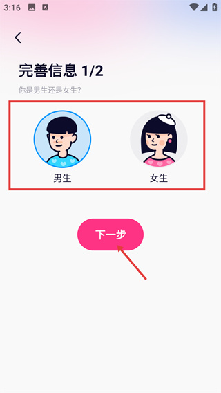 4、在【完善信息1/2步】界面,選擇【男生】或【女生】選項(xiàng),再點(diǎn)擊【下一步】按鈕繼續(xù)完善信息。
