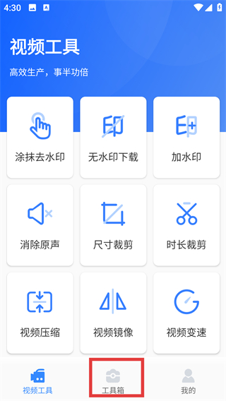 1、在視頻工具頁面點擊底部的【工具箱】選項,進入工具箱功能頁面。