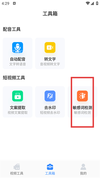 2、在工具箱的短視頻工具板塊中,點擊【敏感詞檢測】選項進入對應功能頁。