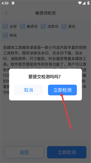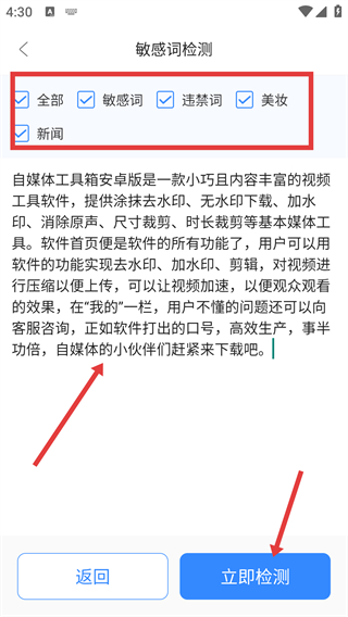 3、在【敏感詞檢測】頁面勾選檢測類別并輸入文本后,點擊【立即檢測】按鈕。
