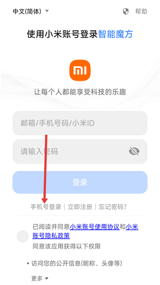 1、在【MISMARTMAGICCUBE】頁(yè)面勾選同意【用戶協(xié)議】和【隱私政策】后,點(diǎn)擊【小米賬號(hào)登錄】按鈕進(jìn)入登錄頁(yè)。