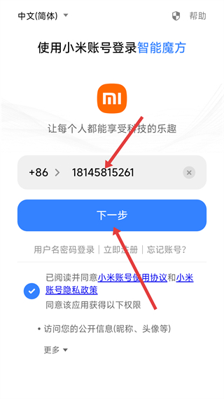 3、輸入手機(jī)號(hào)并勾選同意【小米賬號(hào)使用協(xié)議】和【小米賬號(hào)隱私政策】后,點(diǎn)擊【下一步】觸發(fā)驗(yàn)證碼發(fā)送。