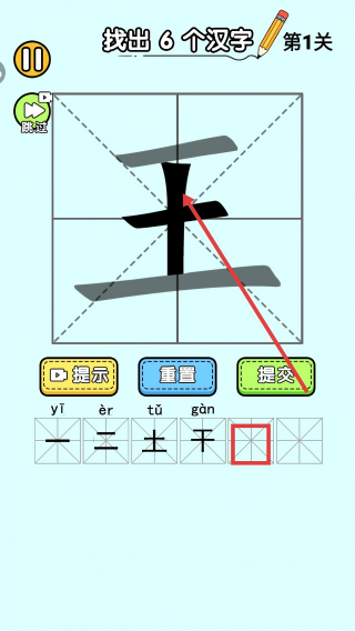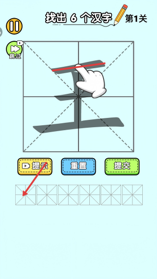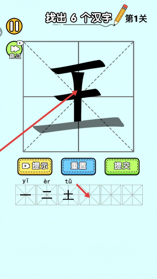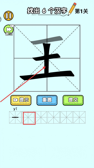 1、第1關(guān)需從“王”字相關(guān)筆畫中找出6個(gè)漢字,可先觀察筆畫,借助【提示】功能輔助查找。