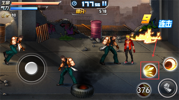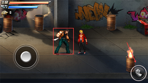 3、將敵人引至【燃燒油桶】附近,借助場(chǎng)景互動(dòng)元素的傷害,配合右側(cè)攻擊鍵提升輸出效率。