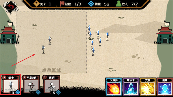 1、消耗【3能量】召喚【劍士】,部署在【點兵區(qū)域】,借助其近戰(zhàn)能力阻擋敵方前排單位,為后續(xù)兵種布局爭取時間。