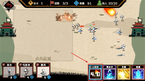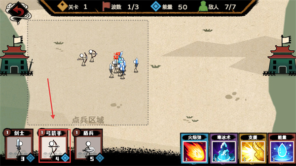 2、花費【4能量】召喚【弓箭手】,搭配已部署的【劍士】,形成近戰(zhàn)+遠程的輸出組合,高效消耗敵方兵力。