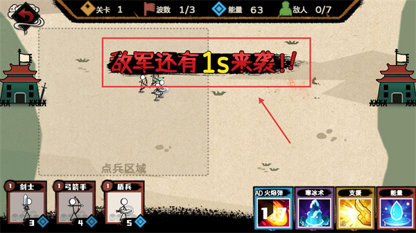 3、看到【敵軍還有1s來襲!!】提示時,快速確認已部署兵種的站位,確保戰(zhàn)線緊湊,準備迎接敵方攻勢。