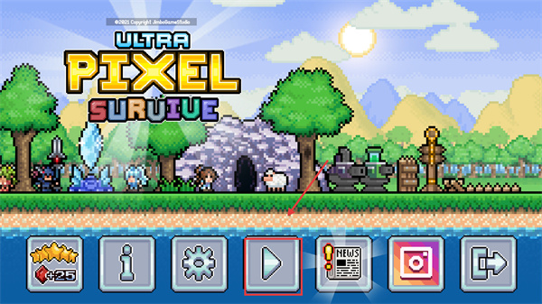 1、這是啟動界面,點擊下方播放按鈕進(jìn)入游戲,該作是融合生存與建造的像素RPG,需通過探索收集資源維持生存。