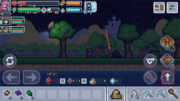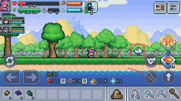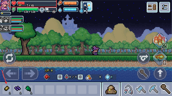 2、當(dāng)遇到史萊姆怪時,通過下方攻擊鍵攻擊,同時留意右上角道具欄的工具使用,為夜間生存儲備物資。