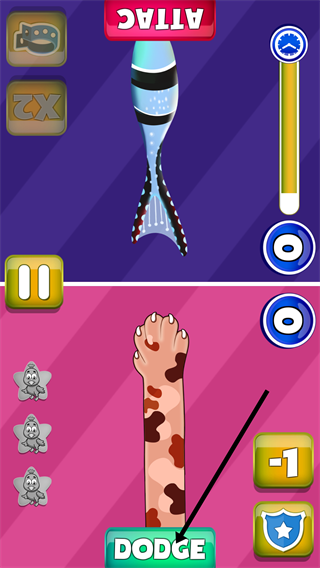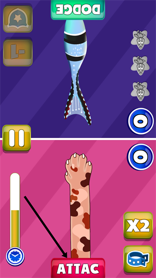 2、當(dāng)上方出現(xiàn)攻擊物時,及時點(diǎn)擊【DODGE】按鈕,躲避攻擊,避免失分。