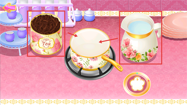 1、按照箭頭指引,將茶罐中的材料與水壺里的液體依次加入鍋中,完成茶飲的基礎(chǔ)制作準(zhǔn)備步驟。
