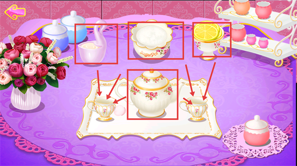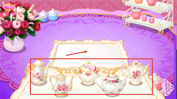 2、選擇托盤上裝飾有花卉圖案的器具,按箭頭方向移動至對應(yīng)區(qū)域,完成器具的擺放與茶飲制作的前置準(zhǔn)備。
