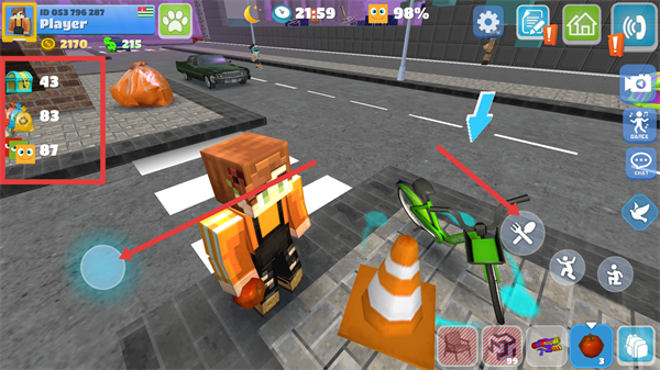 1、界面左側(cè)有【43】【83】【87】等數(shù)值標(biāo)識,可通過界面按鍵操控角色,靠近【自行車】等物品觸發(fā)互動,推進(jìn)游戲進(jìn)程。