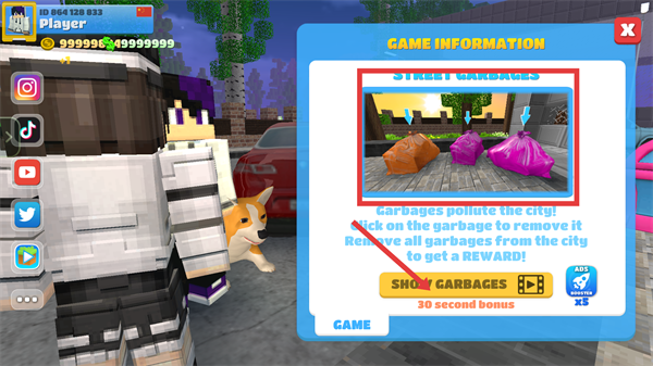 4、在【GAME-INFORMATION】界面中,查看【STREET-GARBAGES】提示,點擊【SHOW-GARBAGES】按鈕清理垃圾,可獲取對應(yīng)的游戲獎勵。