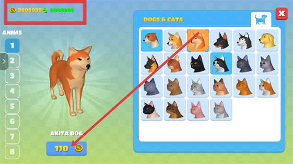 2、進入界面后,第一關卡玩家可選擇喜歡的寵物萌犬,無限玩家可購買多種寵物狗,點擊箭頭指標處。
