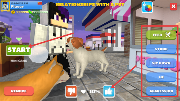 3、在【RELATIONSHIPS-WITH-A-PET】界面,可通過按鈕與寵物互動,提升親密度,還能點擊【FEED】啟動寵物美食。
