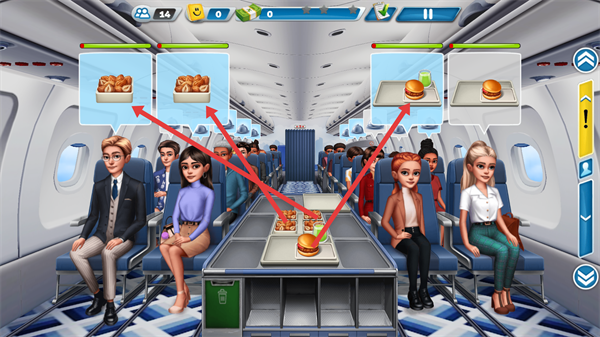 3、進(jìn)入客艙場(chǎng)景后,識(shí)別乘客的餐食需求(如面包、漢堡),從餐車處取對(duì)應(yīng)食物,配送至提出需求的乘客位置,完成服務(wù)以推進(jìn)關(guān)卡進(jìn)度。