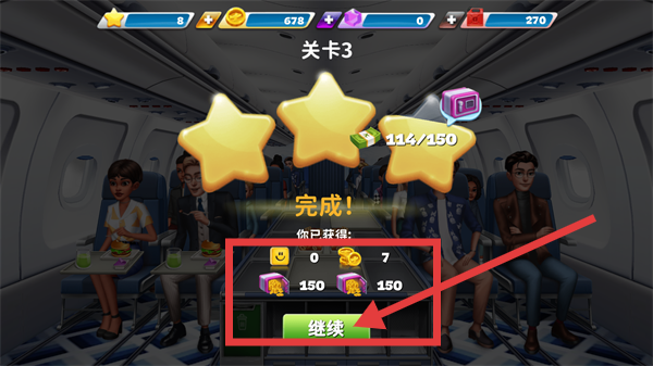 4、完成【關(guān)卡3】的任務(wù)后,會(huì)獲得金幣等獎(jiǎng)勵(lì),界面顯示“完成”提示,點(diǎn)擊【繼續(xù)】按鈕,即可進(jìn)入后續(xù)關(guān)卡繼續(xù)參與相關(guān)服務(wù)任務(wù)。