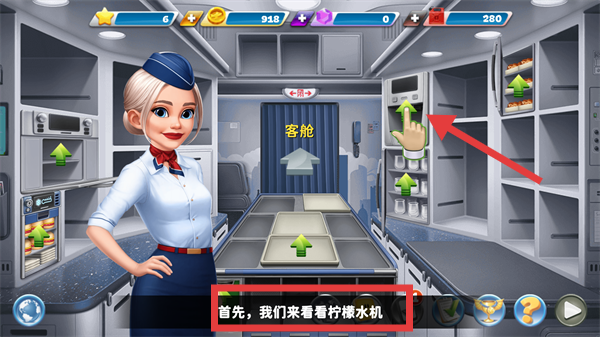 1、處于機(jī)艙廚房場(chǎng)景,根據(jù)提示查看【檸檬水機(jī)】,熟悉該設(shè)備的使用方式,同時(shí)界面顯示當(dāng)前資源數(shù)值,可通過對(duì)應(yīng)區(qū)域操作,為后續(xù)客艙服務(wù)任務(wù)做準(zhǔn)備。