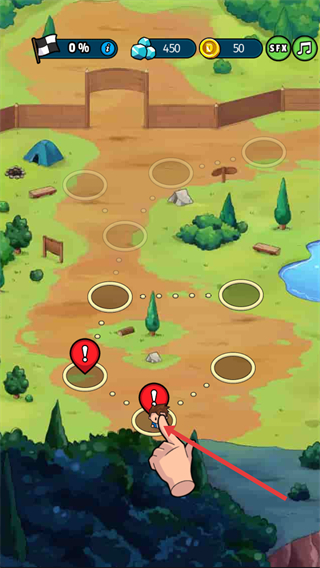 1、處于關(guān)卡初始場(chǎng)景,界面顯示進(jìn)度【0%】及資源數(shù)值,按照指引點(diǎn)擊帶感嘆號(hào)標(biāo)識(shí)的區(qū)域,可推進(jìn)當(dāng)前關(guān)卡的流程進(jìn)度。