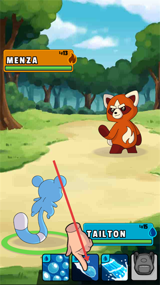 2、進(jìn)入對(duì)戰(zhàn)場(chǎng)景后,界面展示己方角色【TAILTON-lv15】與敵方角色【MENZA-lv13】,點(diǎn)擊對(duì)應(yīng)的技能按鈕釋放技能,參與對(duì)戰(zhàn)以推進(jìn)進(jìn)程。