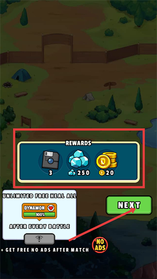 4、完成當(dāng)前環(huán)節(jié)后,會(huì)獲得包含道具、寶石、金幣的【REWARDS】獎(jiǎng)勵(lì),點(diǎn)擊【NEXT】按鈕,即可進(jìn)入下一個(gè)游戲環(huán)節(jié)。