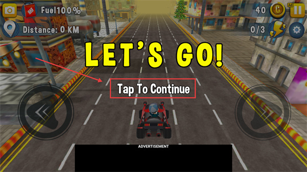 1、游戲初始界面點擊【Tap-To-Continue】開始,注意左上角【Fuel-100%】狀態(tài),開局先熟悉左右操控按鈕。