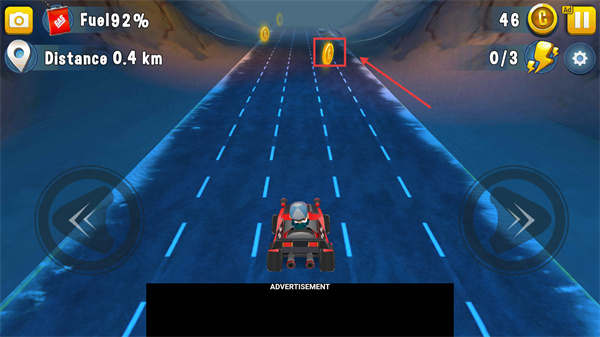 2、行駛中優(yōu)先拾取道路上的【金幣】,同時關(guān)注【Distance-0.4-km】進度,操控機體左右移動避開障礙。