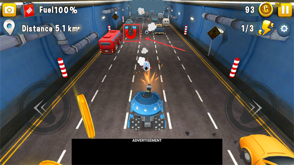 4、拾取【磁鐵】道具后,可自動吸附范圍內(nèi)的資源,同時留意【Distance-5.1-km】下的車輛障礙,靈活避讓。