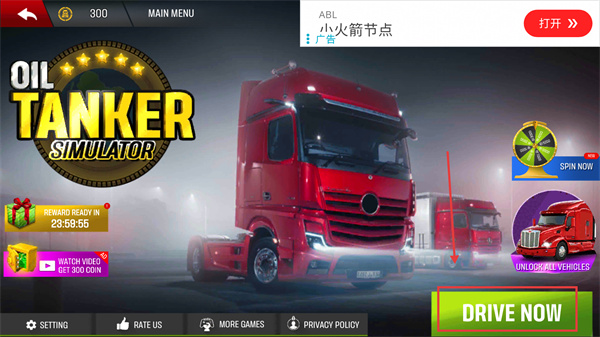 1、進入【OIL-TANKER-SIMULATOR】界面后,可點擊【DRIVE-NOW】開始駕駛,也能通過【W(wǎng)ATCH-VIDEO】獲取300金幣。