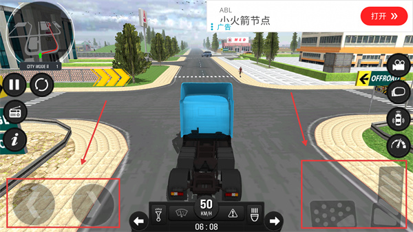 3、駕駛時利用左側方向鍵控制轉向,右側操作區(qū)域調節(jié)車速,同時參考左上角地圖的【CITY-MODE-II】路線行駛。