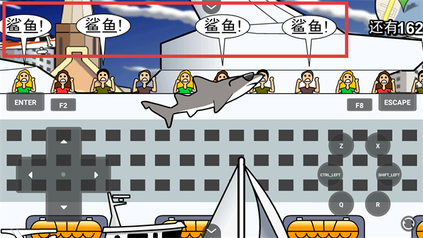 3、操控鯊魚躍出水面,攻擊岸上角色,觸發(fā)【鯊魚!】的提示互動,積累游戲得分。