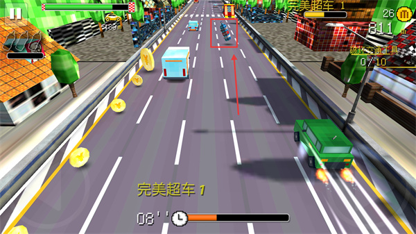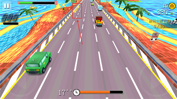 2、駕駛時(shí)通過(guò)左右方向鍵控制賽車變道,避開(kāi)前方車輛,同時(shí)推進(jìn)【破壞交通工具-0/10】任務(wù)進(jìn)度。