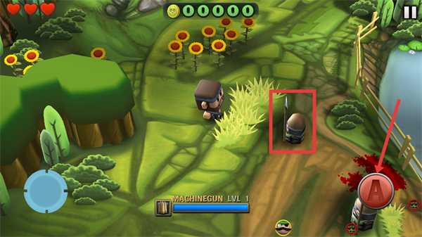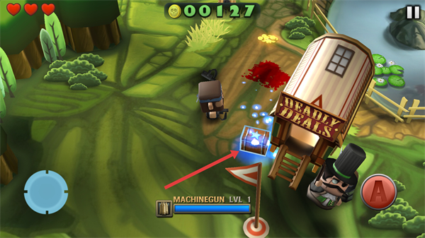 3、移動(dòng)到“DEADLYDEALS”商店旁,拾取藍(lán)色道具(如資源箱),積累金幣或強(qiáng)化材料,用于后續(xù)武器升級(jí)。