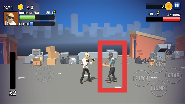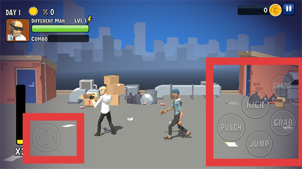 2、在【DAY-1】中,用左側(cè)方向鍵移動(dòng)角色,搭配【PUNCH】-【KICK】技能對(duì)戰(zhàn)敵人,靈活切換動(dòng)作提升戰(zhàn)斗效率。