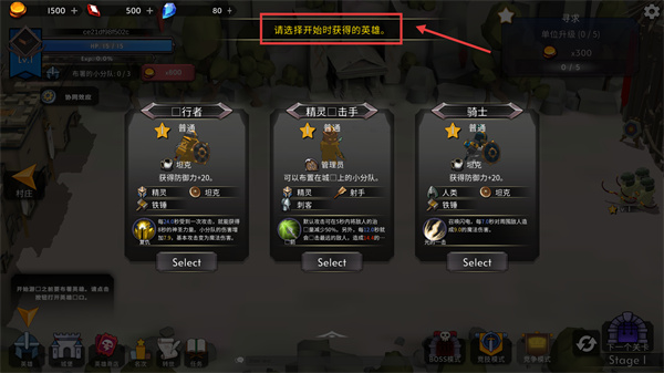 1、在【請選擇開始時獲得的英雄】界面,可選【行者】【精靈弓手】等英雄,不同英雄對應(yīng)不同種族與增益效果。