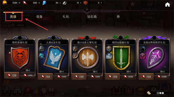 4、進入【英雄】界面,可消耗資源購買不同陣營的英雄禮包,獲取對應(yīng)種族的強力英雄提升隊伍強度。