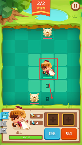 2、在【2/2-波怪物】關(guān)卡中,操控【戰(zhàn)士】移動(dòng)到怪物附近,利用其18點(diǎn)攻擊屬性準(zhǔn)備接戰(zhàn)。